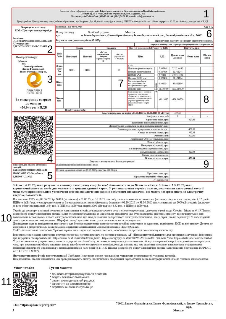 3. Інформація про споживача: № договору, прізвище, ім’я, по батькові, адреса, сума до оплати.