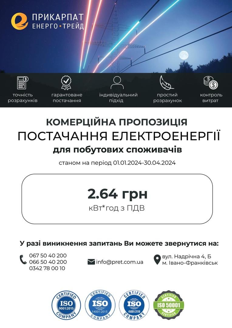 Комерційна пропозиція №1 «Для дому із застосуванням ціни, не диференційованої за періодами часу (годинами) доби » на період з 01 січня 2024 року по 30 квітня 2024 року