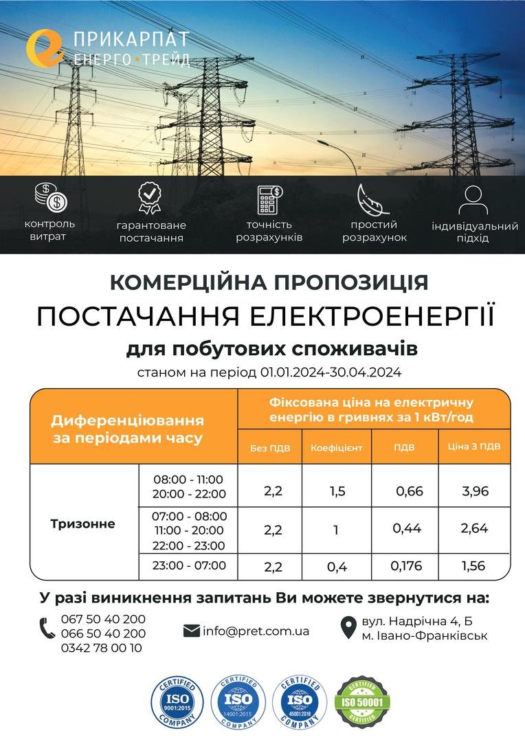 Комерційна пропозиція №1.2 «Для дому з тризонним диференціюванням за періодами часу» на період з 01 січня 2024 року по 30 квітня 2024 року