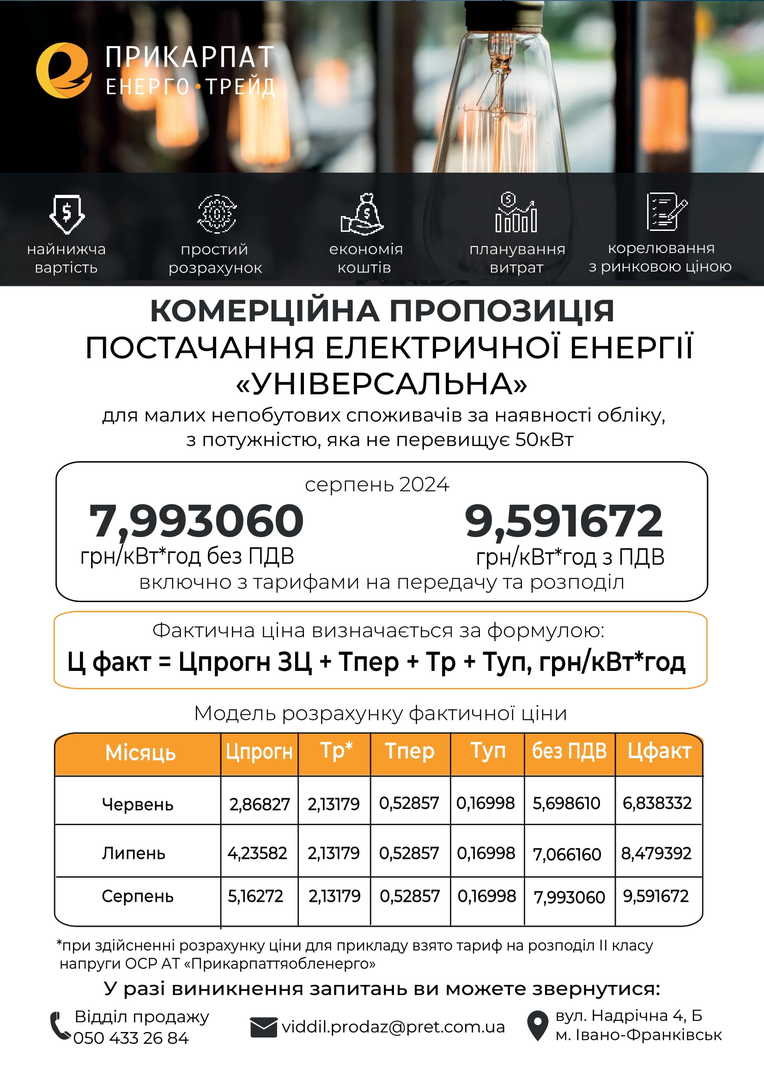 Комерційна пропозиція №4 «універсальна» для малих непобутових споживачів (попередня оплата) на серпень 2022